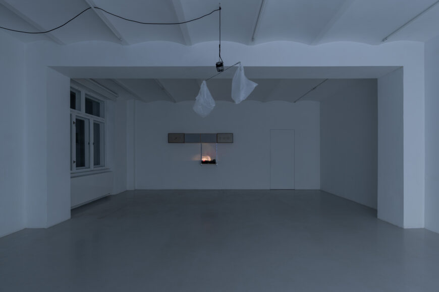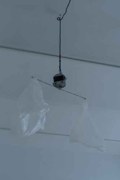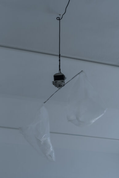 Fly Repellent, 2012, Monika Sosnowska, (for Parkett 91), two plastic bags, wire, electric motor, cable, 23 1/2” diameter. ©Monika Sosnowska, courtesy artist, Foksal Gallery Foundation and Parkett.